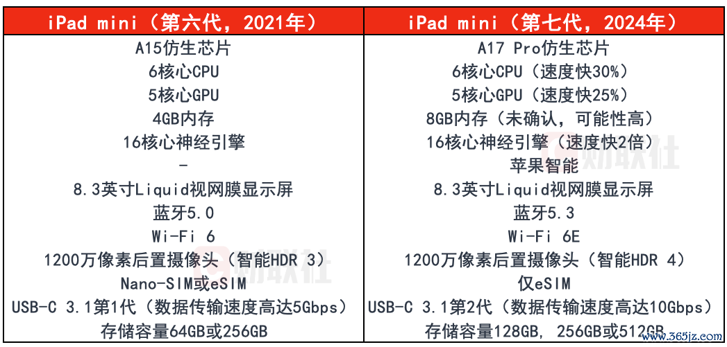 升级方面,相较于上一代居品,iPad mini 7的芯片从A15(iPhone 13 Pro)普及至A17 Pro(iPhone 15 Pro Max)。CPU和GPU性能分散普及30%和25%,以及硬件加快的爽直跟踪,神经集结的处理速率也翻了一倍。另外由于要跑AI,是以天然官方没提,但合理估计内存会从4GB翻倍至8GB。