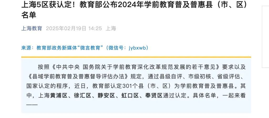 △2月19日,“上海阐发”发布稿件《上海5区获认定!阐发部公布2024年学前阐发提高普惠县(市、区)名单》